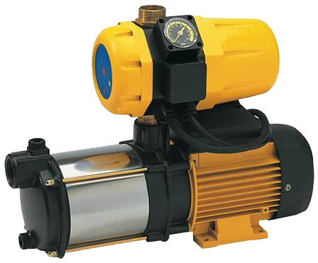 Compuestos de electrobomba y equipo compacto de presurización, con manómetro, dispositivo electrónico de desconexión cuando la bomba funciona sin agua, pulsador de rearme y válvula de retención. Evita el golpe de ariete y no precisa precarga de aire.